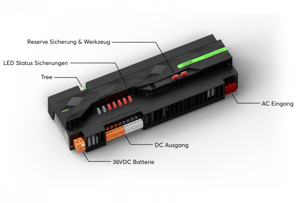 - Notstrom über externe gänige 36VDC Blei-Säure-Batterien bis 200Ah